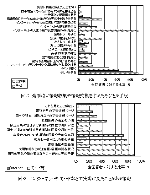 (3)豪雨時に情報を入手・交換する手段 豪雨に遭遇した場合に,情報収集のためにどのような行動をとると予想されるか(予想),また実際に過去にどのような行動をとったことがあるか(実体験)を尋ねた設問(複数回答可)に対しては,図-2のような回答が得られた.「予想」において最も多い92%の回答者が挙げたのは,「テレビを見る」および「インターネットの天気予報や災害関係のWebを見る」であり,インターネットが防災情報収集手段として大いに活用されている現状がうかがえた.「携帯電話の天気予報などを見る」を挙げた回答者は36%で,意外に多くなかった.伝統的な「テレホンサービスに電話する」を挙げた人は22%程度であった.